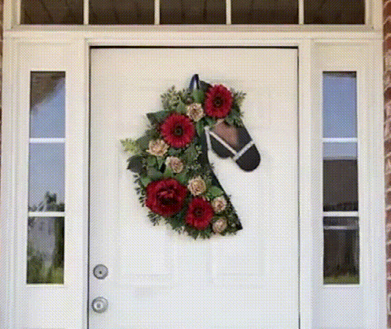 Welcome the holiday season with this Christmas Horse Head Floral Wreath, featuring rich red blooms, winter greenery, and sparkling accents that bring warm festive spirit to any front door or indoor space.